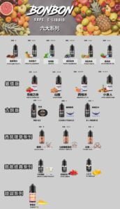 | 口味 | 美國條約, 今夜無飲, 小芒芒, 七星菸草薄荷, 黑牌煙草, 王牌煙草, 曲奇煙草, 黑標五木煙草, 西柚, 红冰, 山楂, 混合水果, 惡魔之吻, 薄荷糖, 菠萝椰汁, 西瓜冰, 小綠人, 混合蓝莓, 法式檸檬派 |